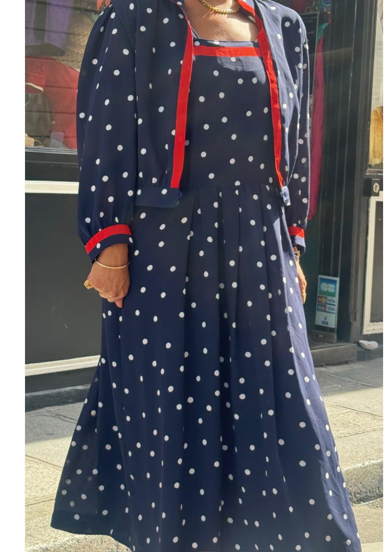 Liste de souhaits Ajouter pour comparer Ensemble Marine à Pois... 79,00 € Ajouter au panier Quick view Ensemble Vintage 80’s Marine à Pois Blancs – Robe & Veste . Marqué: Fink Modell