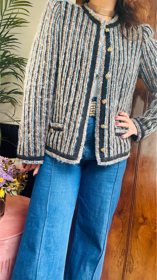 Veste cardigan vintage à rayures texturées dans les tons bleu, beige et noir. Boutons dorés et col rond chic. Taille 38/40